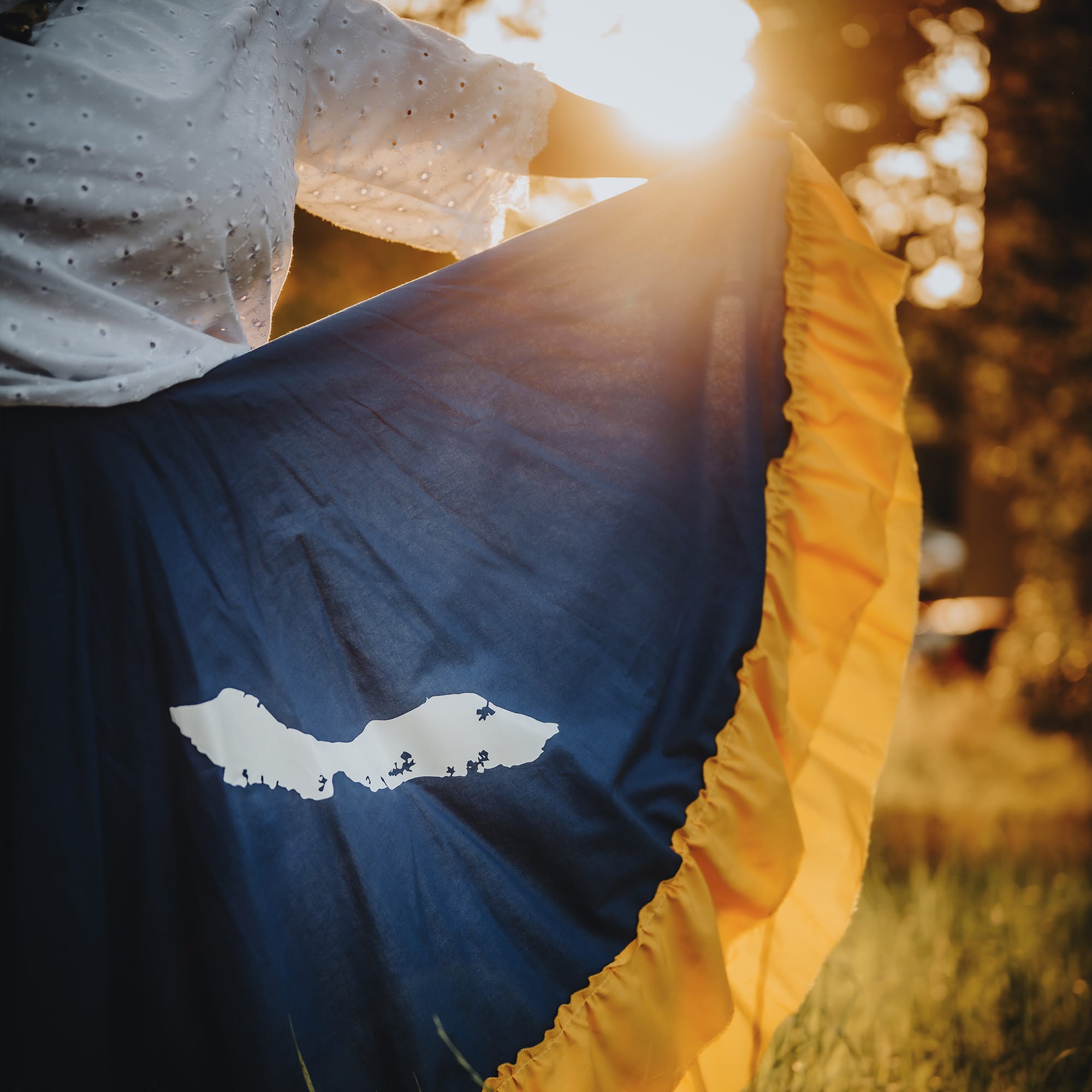 “Wat ik hier nu draag is een outfit voor vlaggendag “dia di Bandera”. Natuurlijk staat de Curaçaosevlag er op. Het blauw staat voor de Caribischezee die ons omringt, geel voor de stralende zon en de witte sterren voor onze vijf Caribische eilanden: de kleuren van ons ‘Dushi Korsou’ (heerlijke mooie Curaçao). Dit draag ik op speciale dagen, als een ode aan mijn roots.”