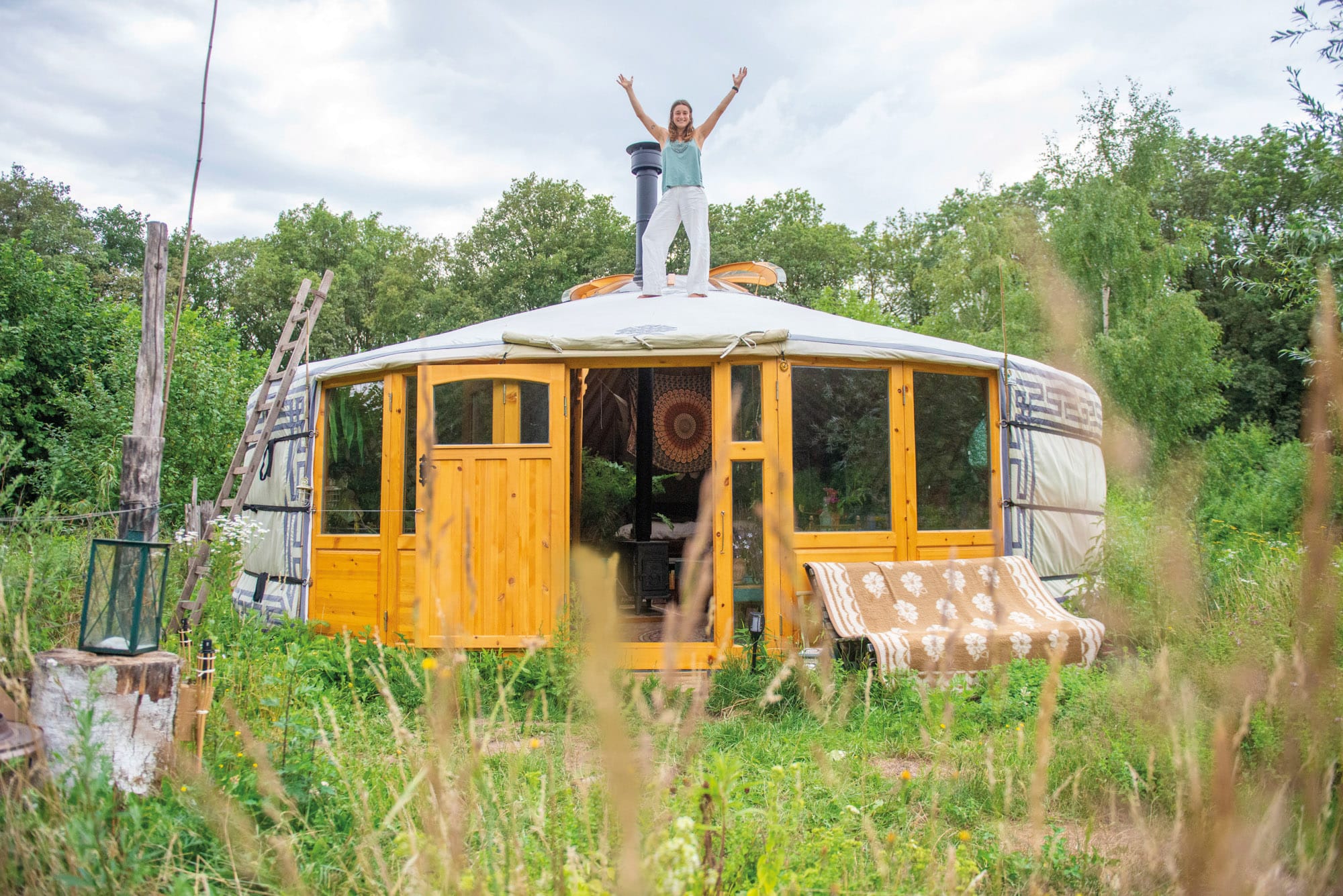Het inrichten van een ronde woonruimte lijkt best een uitdaging. Violaine: “We hebben verschillende yurts bekeken en een digitale plattegrond gemaakt. Maar het inrichten ging eigenlijk vanzelf. Wel moesten we bijna alles nieuw-tweedehands kopen, want onze oude meubels pasten niet. Zo hebben we ons elektrisch verstelbare bed ingeruild voor een houten bed met lades eronder voor extra opslagruimte. En in plaats van onze grote hoekbank hebben we nu een kleinere driezitsbank.” Violaines interieurstijl is een mooie combinatie van bohemian, kleur en vintage, maar met een rustige uitstraling. Tot nu toe mist ze niks uit een ‘gewone’ woning. “We hebben alles wat we nodig hebben. Op het terrein zijn compostwc’s en een douche met warm water. Hoe het in de winter bevalt, is nog afwachten. Zolang de kachel ’s nachts kan blijven gloeien, voorzie ik geen problemen met de kou. Wat nog wel spannend is: als het hard vriest, wordt het water afgesloten. Dan moeten we met jerrycans water slepen. Maar dat vind ik juist het mooie van wonen in een yurt. Dingen die vanzelfsprekend leken, ga ik meer waarderen. Ik voel me meer verbonden met de natuurlijke omgeving en daardoor met mijzelf.”