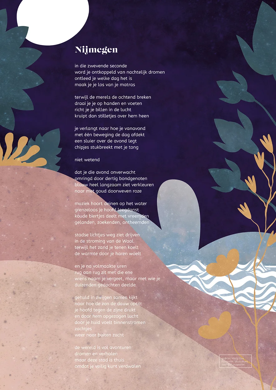 Speciaal voor BEP magazine schreef Yildiz Gies een gedicht over Nijmegen. Natuurlijk is deze te bewonderen in het magazine #1 zelf, maar we hebben hem ook op mooi mat papier geprint. Bestel deze prachtige poster op A2 formaat en geniet van de mooie woorden aan je muur.